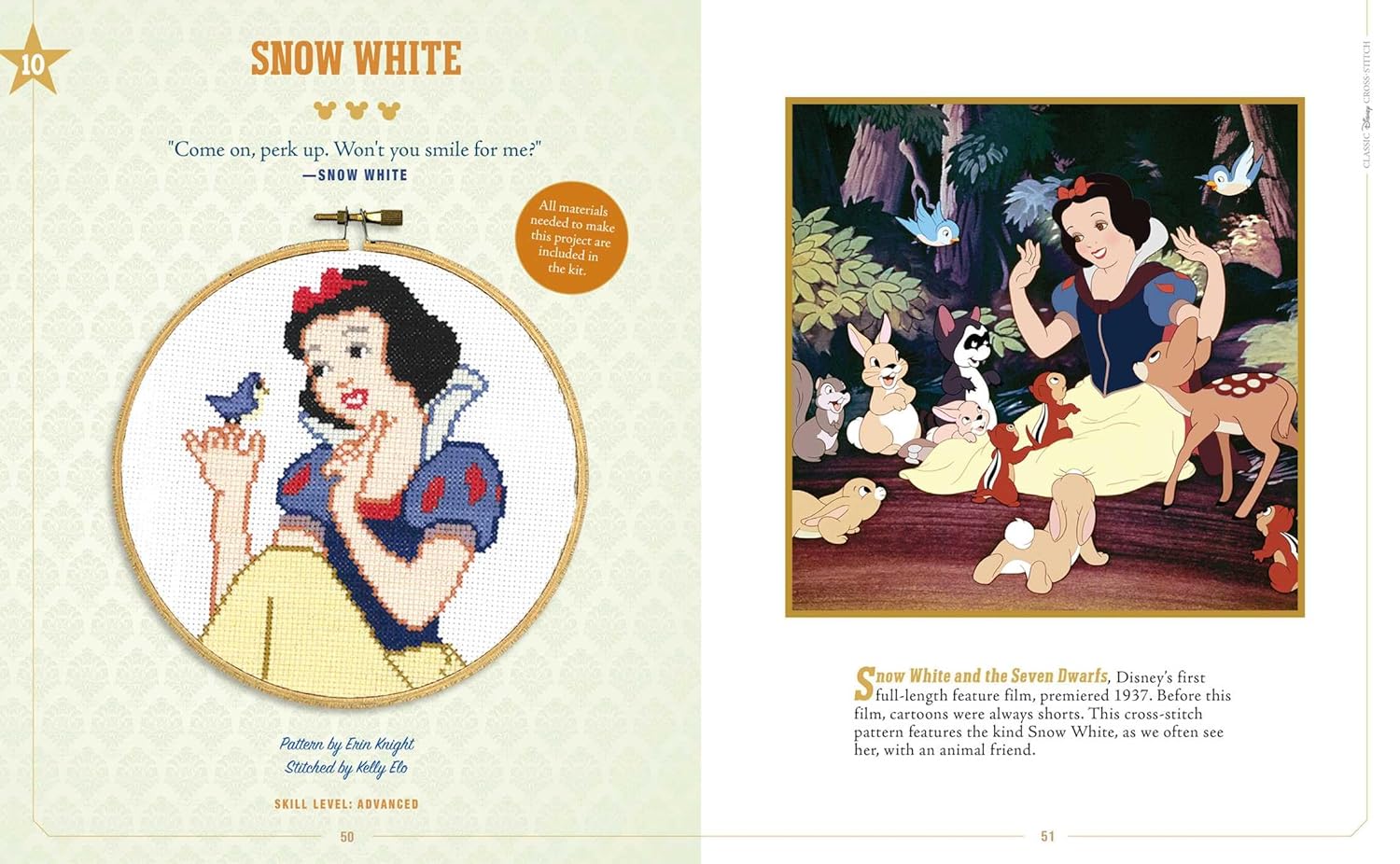 One of the easiest and most accessible forms of embroidery to learn, cross-stitch has long been a favorite of beginning and experienced crafting enthusiasts. Classic Disney Cross-Stitch lets you add a touch of Disney magic to everyday items. A 64-page instruction book provides patterns and step-by-step instructions for creating 12 projects featuring classic Disney characters such as Cinderella, Sleeping Beauty, and Bambi. Use the finished projects to embellish hand towels, baby onesies, bookmarks, and more! The kit includes all materials to stitch two fun projects (Snow White and Sorcerer Mickey from Fantasia): a 6-inch bamboo hoop, 2 pieces of 14 count white Aida fabric, 20 colors of cross-stitch floss, and 2 needles. From Peter Pan and Tinker Bell ornaments to a Sneezy handkerchief and a Winnie-the-Pooh bib, with this fun collection of cross-stitch projects, you can create unique gifts, home goods, decor, and more!