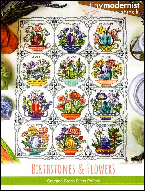 Make this large sampler-style design with each month's birthstone and flower in a bright basket. These would be fun stitched separately and finished as smalls!