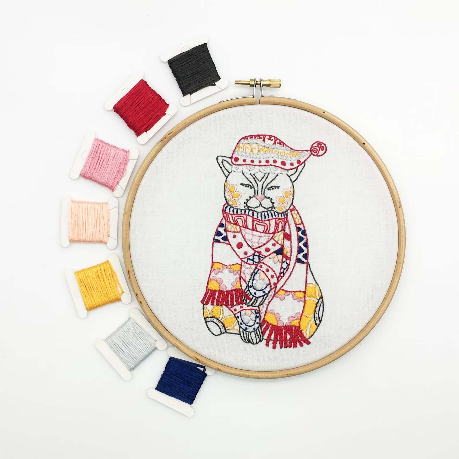 This Christmas cat embroidery design is printed on to 100% cotton fabric, saving the hassle of transferring the design onto fabric, but still giving the freedom to use any colours to create a unique piece of embroidery artwork.