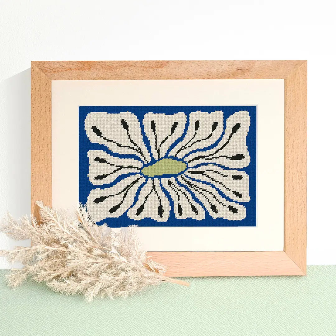 This blue-toned abstract flower design by Maore Sagarzazu showcases her signature bold shapes and playful energy. “Eleonora” brings life and color to your wall while offering an engaging and meditative stitching experience.