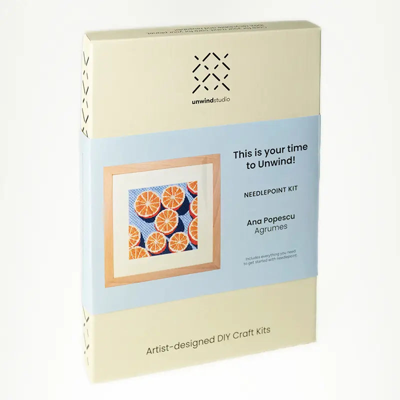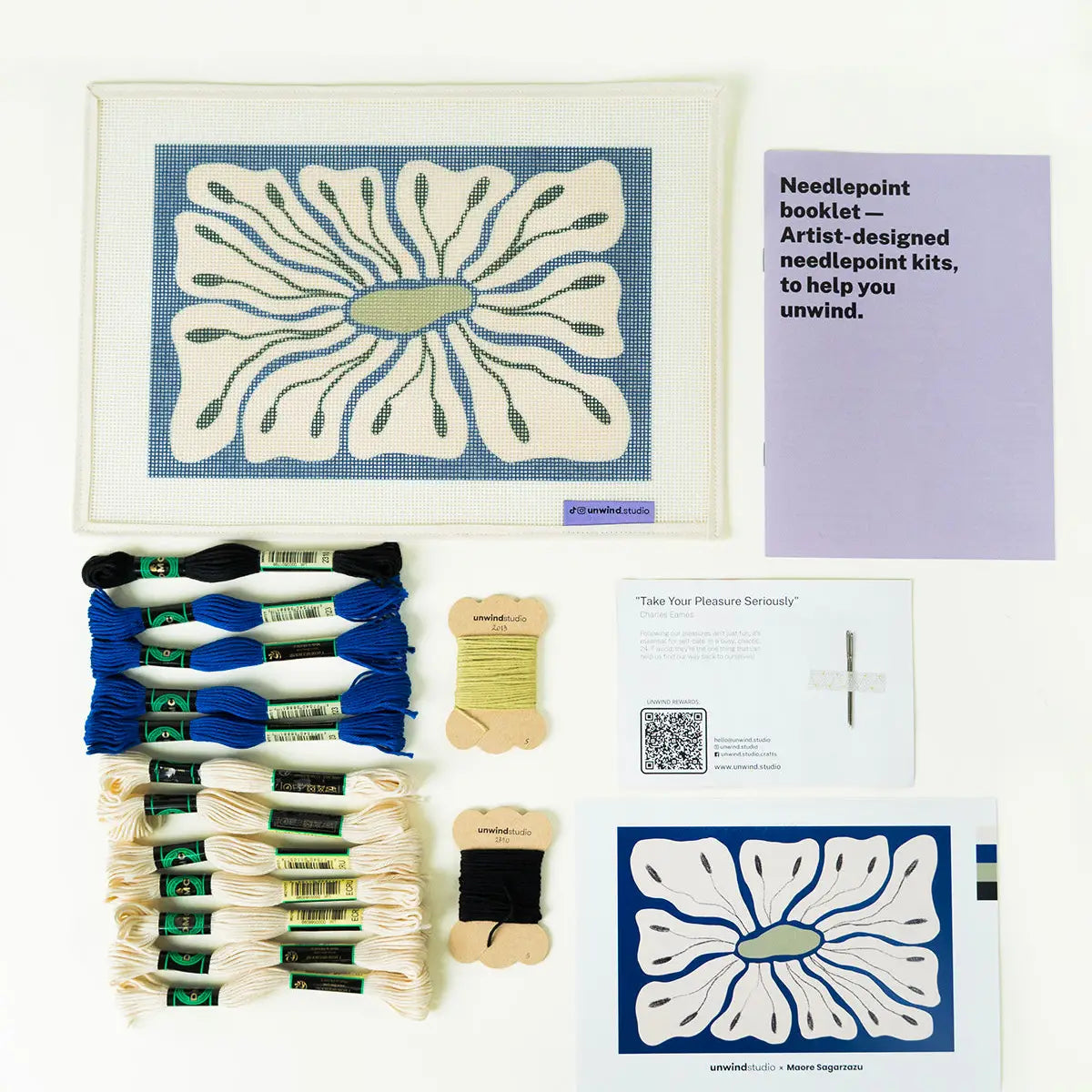 What is included in the “Complete Needlepoint Kit” option: Printed interlock canvas, with edges sewed with cotton bias tape 2 tapestry needles Flyer with the color threads mapping Threads with enough quantity to stitch with the continental tent stitch Needlepoint booklet with instructions on starting needlepoint, tips for selecting needlepoint stitches, and a library of favorite stitches
