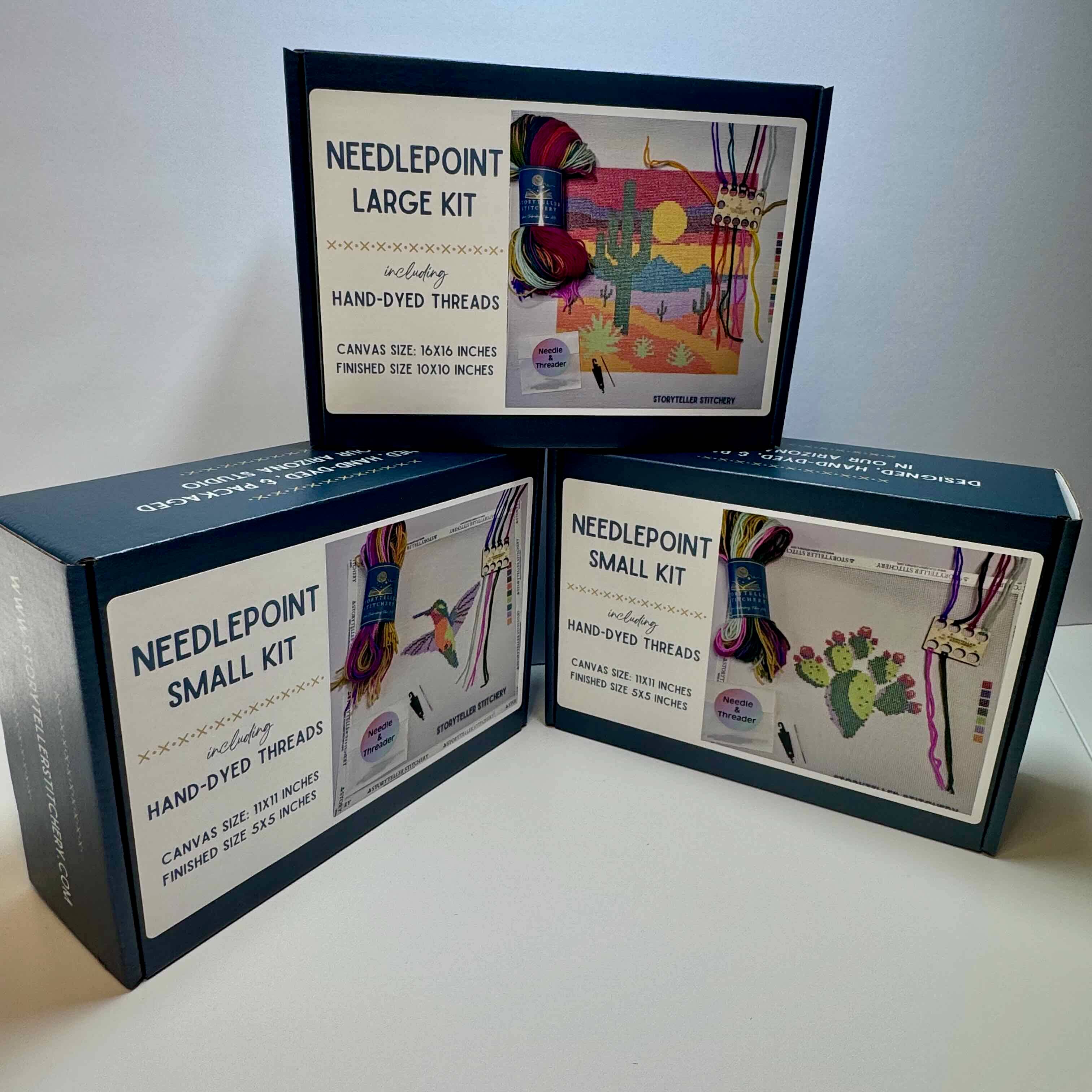 Storyteller Stitchery’s modern needlepoint kits blend hand-dyed color with timeless craft. Each small kit includes everything your customers need to stitch a beautiful, frame-ready piece of art. Designed for all skill levels, our kits invite creativity, relaxation, and storytelling through stitches. Includes: – Printed needlepoint interlock canvas (14 mesh) – Hand-dyed wool threads (custom dyed for each design) – Size 20 Bohin tapestry needle and threader – Illustrated stitch guide with clear instructions Product Details: – Finished Design Size: 5” x 5” – Canvas Size: 11” x 11” – Skill Level: Suitable for any skill level – Packaging: Shelf-ready box, ready for display Designed, hand-dyed, and carefully packaged by our small team in sunny Arizona.