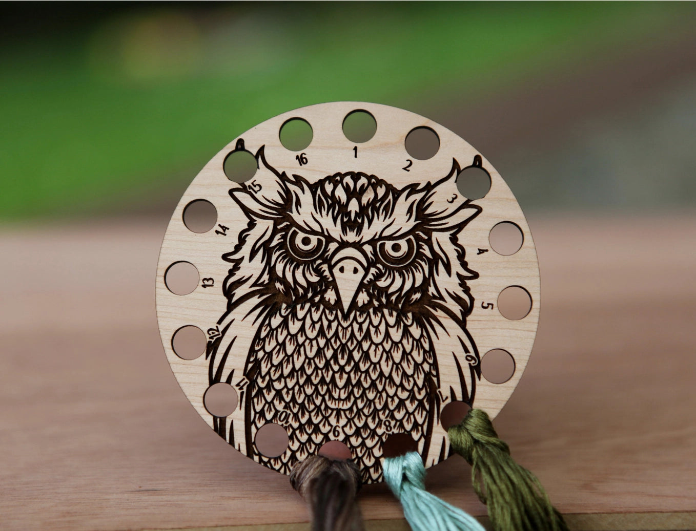 Embroidery floss organizer made from cherry wood. This owl needlepoint thread holder has 16 circle holes to keep your yarn organized. Great for those who love these creatures of the night as much as I do. Owls are a symbol of being able to navigate the darkness in our lives as well as symbols of wisdom, mystery and death.