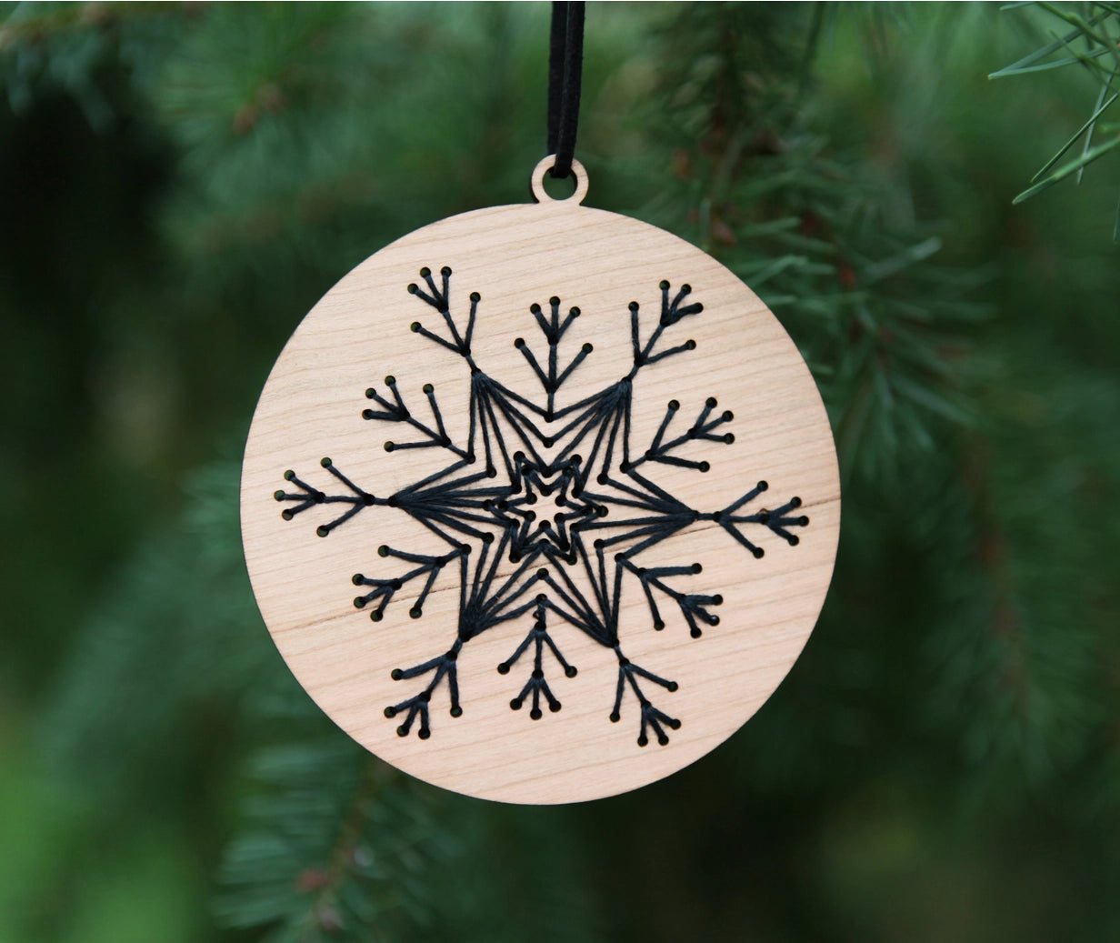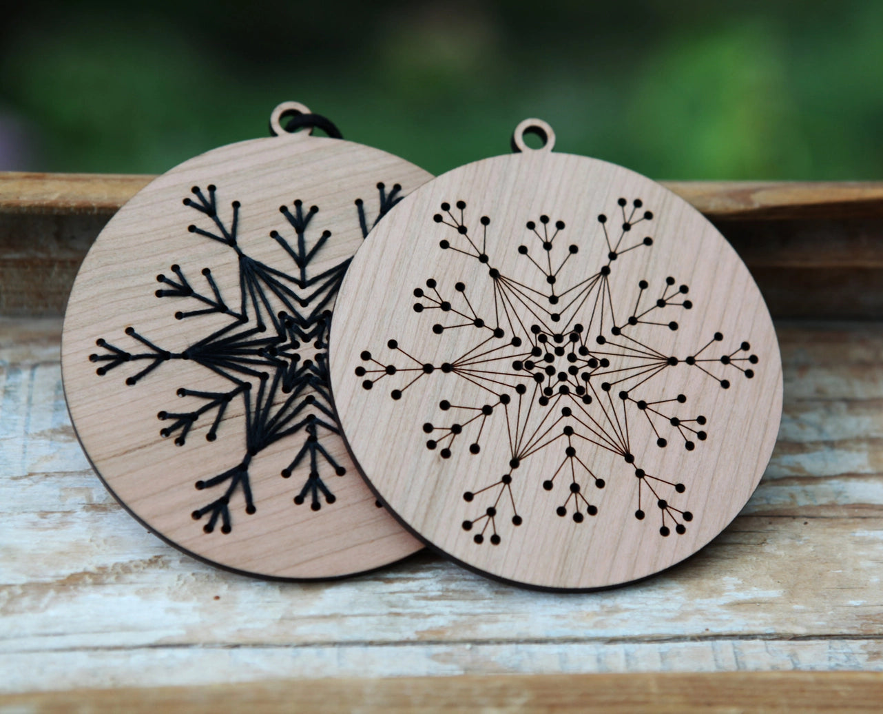 Embroidery Snowflake DIY Ornament made from cherry wood (and only includes the wood and felt wool backing). Hand embroiders this winter snowflake ornament with your favorite floss thread colors. Great for hand needlepoint, embroidery, cross-stitch, and other needle art. Hang it on your holiday (Christmas) tree or keep it up year-round.
