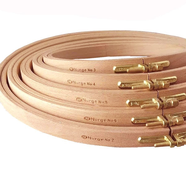 Nurge Superior quality embroidery hoops made from hard beech wood ~ Fine sanded and hand polished for a super smooth natural wood finish. With a brass screw adjuster. The adjustment screw and threaded angle bracket fittings are made from pure brass and polished for a rich, striking gold color look. This improves the presentation of your work.