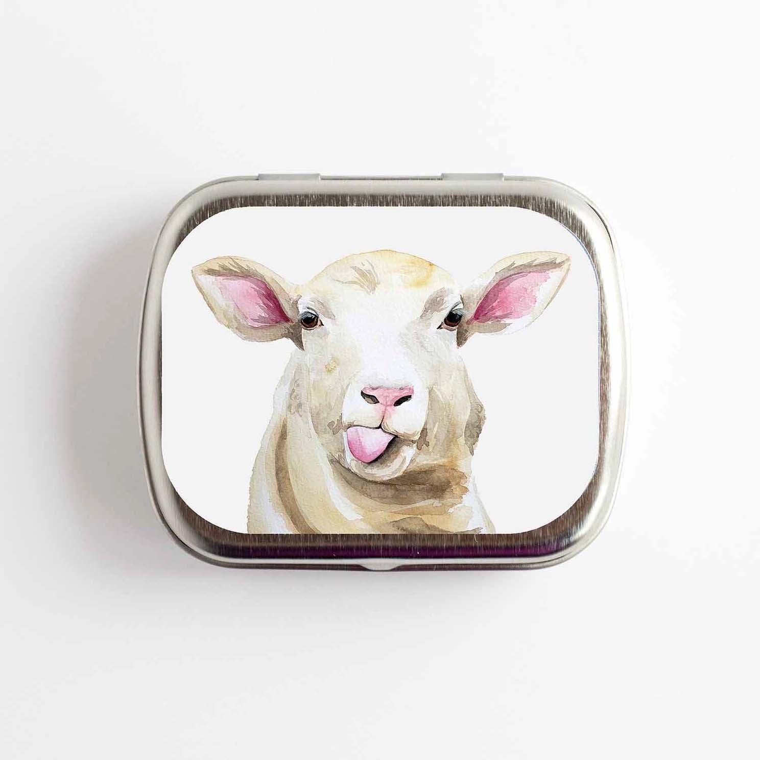 Your tin will come bedecked with a sticker bearing our exclusive watercolor sassy sheep painting hand painted by our lead designer Dawn Prickett.