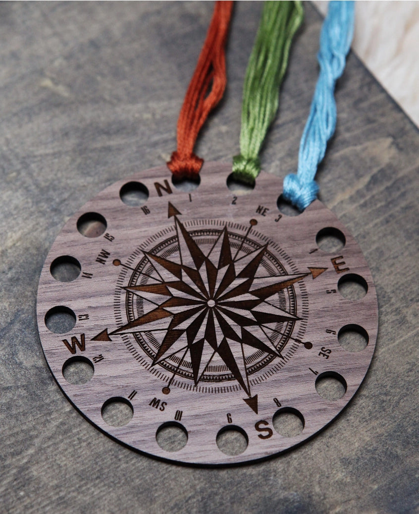 Find your way with this compass embroidery floss organizer made from walnut wood. This needlepoint thread holder has 16 circles to keep your yarn organized. Whether going north, south, east or west, you will find how to get there with this navigational guide.