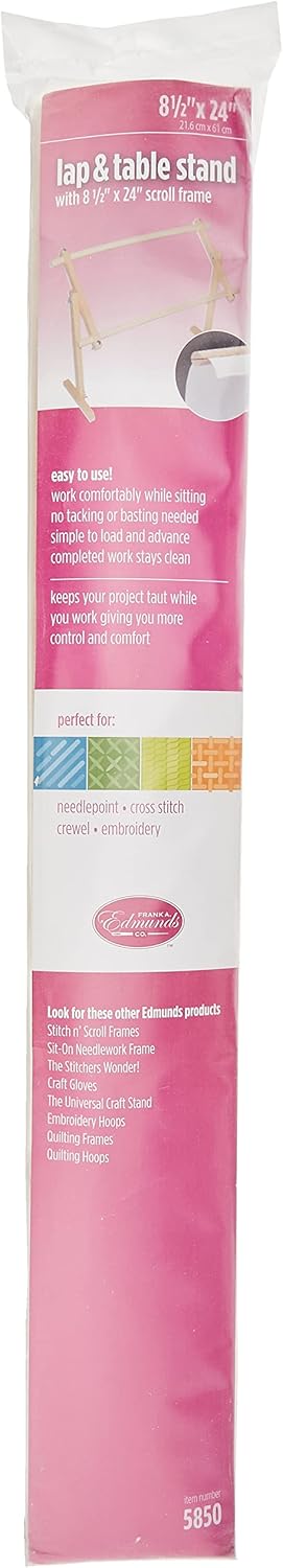 This convenient lap stand allows you to work with both hands free for better stitch control. Adjustable to different heights and widths, this stand comes complete with an 8.5″ x 24″ Split Rail scroll frame which will fit fabric up to 21″ wide. Perfect for use in your favorite chair, couch, bed, on a table, or in the car. Not recommended for thicker fabrics such as burlap.