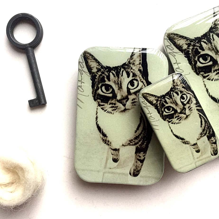 This lovely vintage cat  illustration is from a cool vintage illustration that was gifted to me. I restored it and it is now the latest addition to my tin collection. A glossy coat of resin is poured over it to give it a sleek and durable finish atop a handy slider tin. Perfect for corralling those rogue needles (and they hold a lot more then that!)