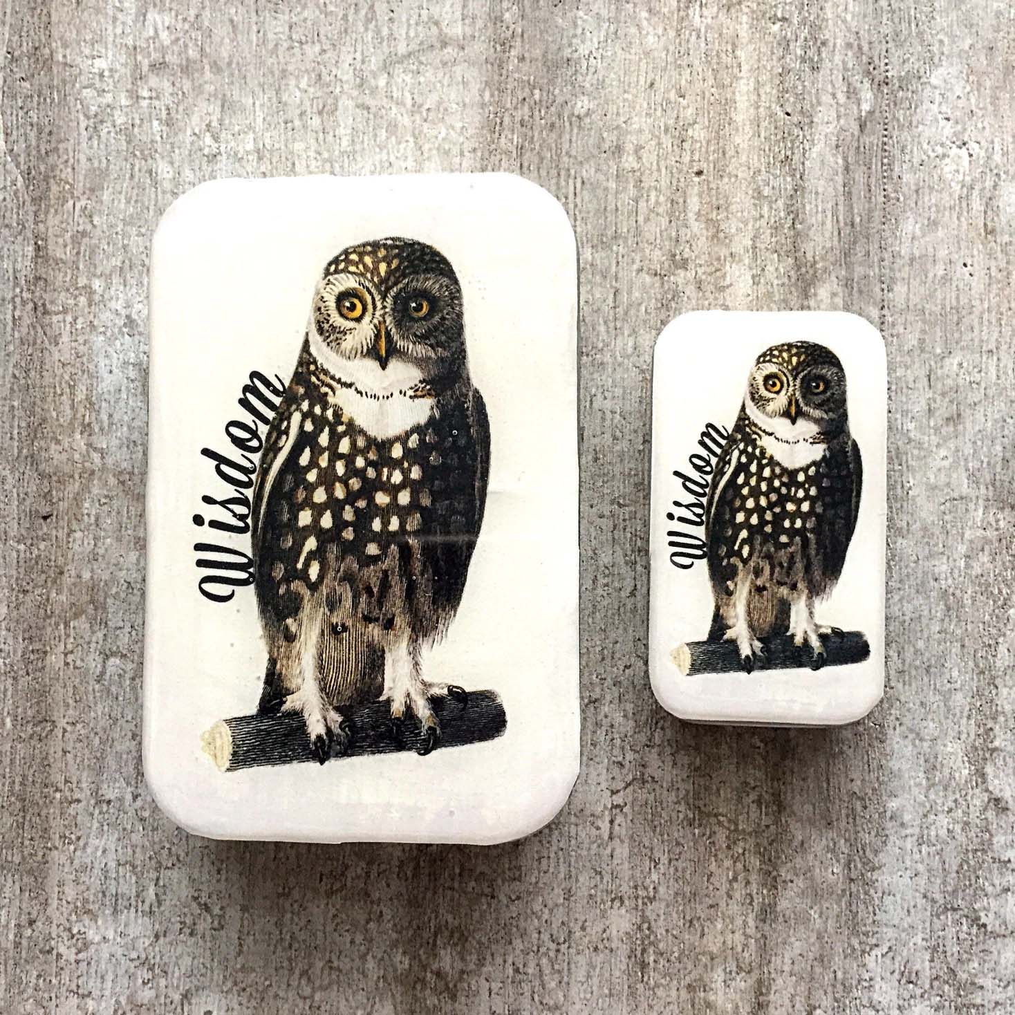 Lovely vintage owl illustration that I rebooted and crafted atop this glossy resin coated slider tin.