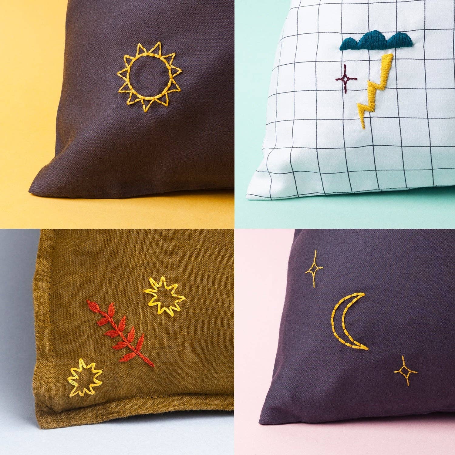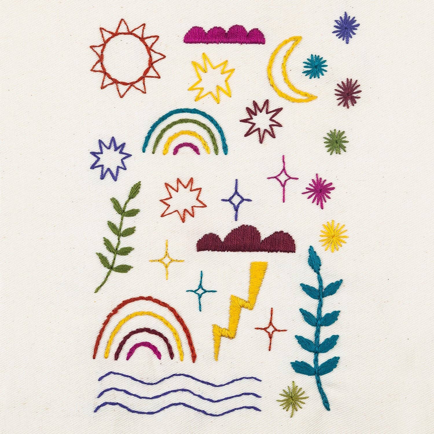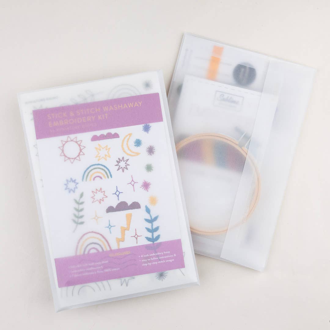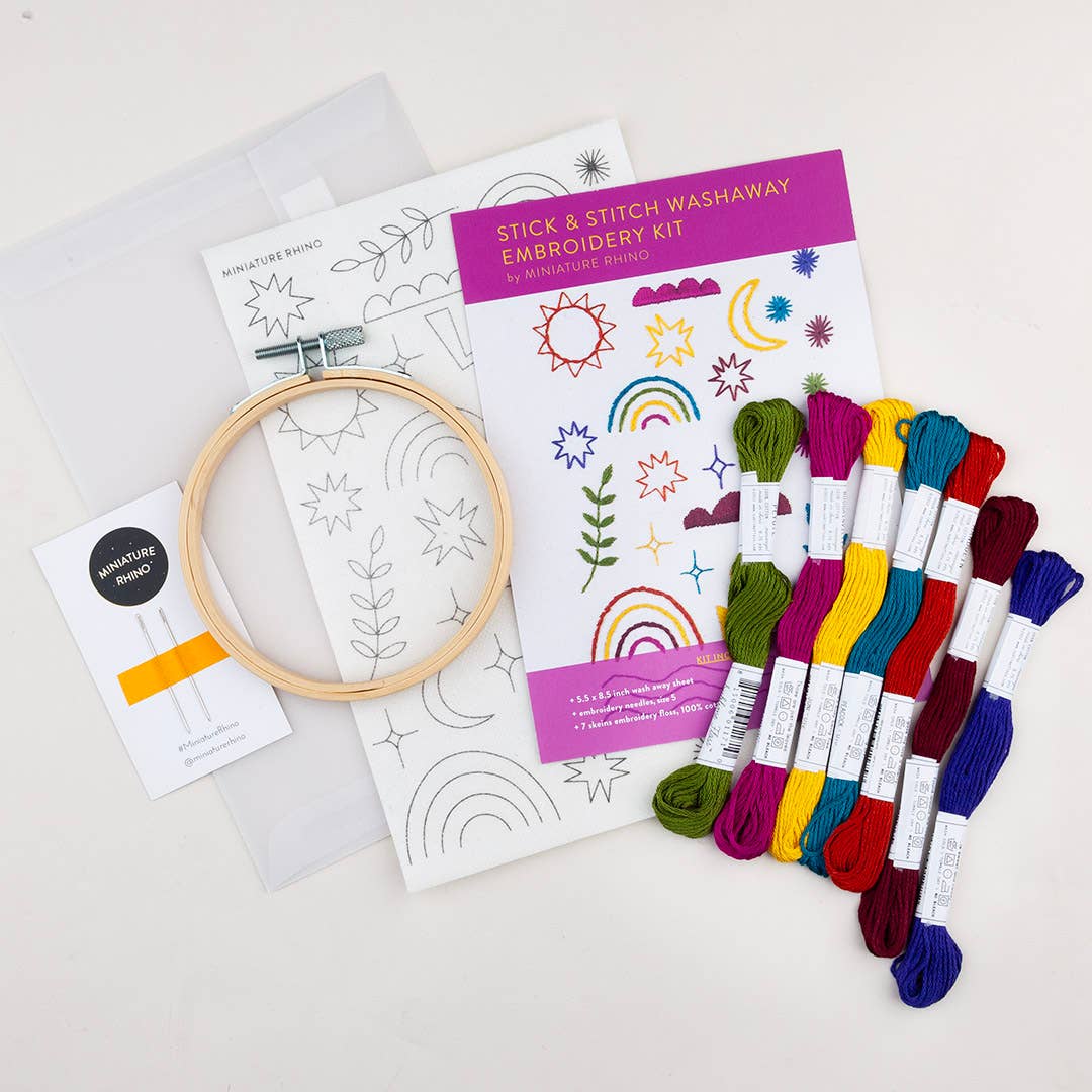 Learn to embroider with these super cute and easy to use patterns. Just stick, stick and wash away. Stitch the pattern as a whole or cut out pieces to make smaller motifs to decorate your clothing and textiles. It's a fun, beginner friendly introduction to hand stitching. Instructions include step by step images for making four of the most popular embroidery stitches + Set of Embroidery Needles + Sublime Stitching Floss: 7 full skeins of 100% cotton floss + 4" bamboo wood hoop + 5.5 x 8 water soluble transfer sheet + Instructions with step-by-step images